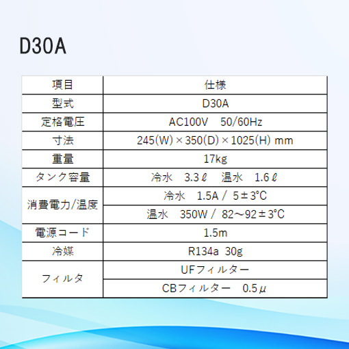 TOP浄水器 冷水・温水・常温水 D30A white 価格: ¥70,900 (税込 ¥77,990) 販売期間: 数量: 台 在庫: ○ 在庫 ○ 返品についての詳細はこちら 水道直結型浄水器 D30Aです。 横幅245mmとスリム、冷水・温水に加えて常温水も使用可能です。 フィルターはUF,カーボンブロックの2本、前面のカバーは簡単に外して交換ができます。